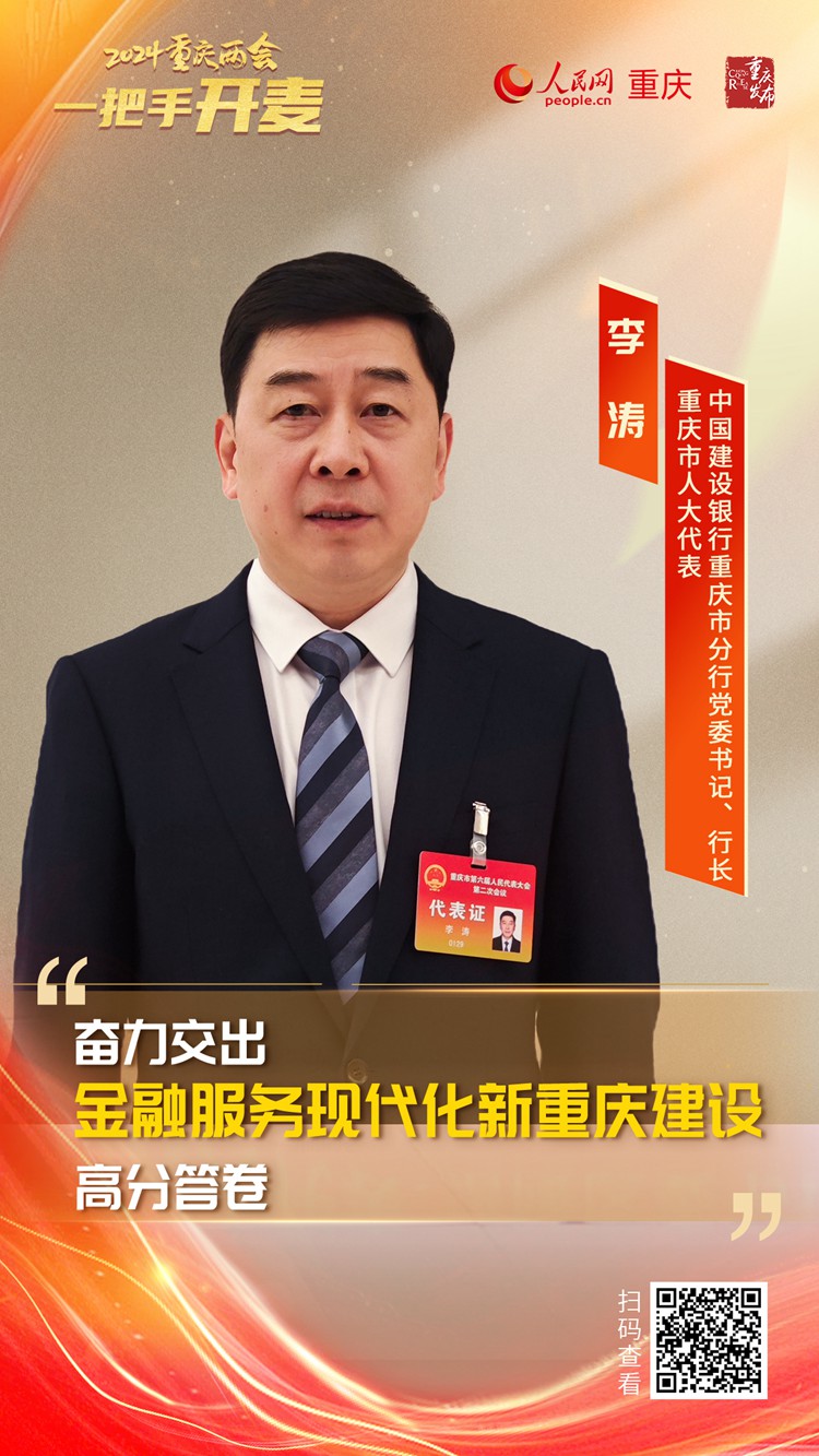 人民網(wǎng)重慶1月23日電 2024重慶兩會期間,重慶市人大代表,中國建設(shè)銀行重慶市分行黨委書記、行長李濤在接受人民網(wǎng)專訪時表示,該行將始終胸懷“國之大者”,不斷增強(qiáng)金融工作的政治性、人民性、專業(yè)性,緊緊圍繞成渝地區(qū)雙城經(jīng)濟(jì)圈、西部陸海新通道建設(shè)等重大戰(zhàn)略,持續(xù)提升“三個能力”,全力做好科技金融、綠色金融、普惠金融、養(yǎng)老金融、數(shù)字金融五篇大文章,全力服務(wù)“三大工程”以及“三攻堅一盤活”等重點(diǎn)工作任務(wù),以實干擔(dān)當(dāng)奮力交出金融服務(wù)現(xiàn)代化新重慶建設(shè)的高分答卷。