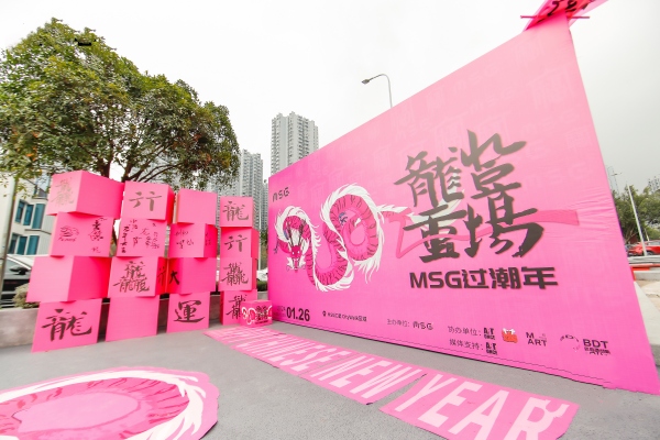 從策展布景到禮品周邊,大膽采用新穎前衛(wèi)的粉紅色系設(shè)計,將傳統(tǒng)書法與潮流文化相結(jié)合,打造出獨樹一幟的MSG新中式“潮”年。