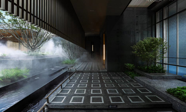 項(xiàng)目負(fù)責(zé)人介紹,萬科璞園·璞玉入戶空間整體挑高約4.8米,吊燈、吧臺(tái)、墻面、壁燈等設(shè)計(jì)融合了傳統(tǒng)文化元素;下沉庭院,結(jié)合建筑空間,用漸變玻璃磚打造了約7.5米的飛瀑。