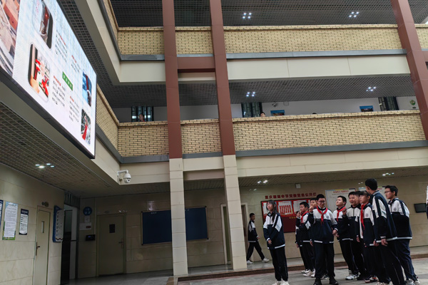 學(xué)生在LED屏前學(xué)習(xí)安全文明交通出行知識(shí)。袁杰攝