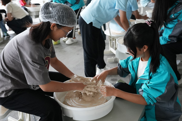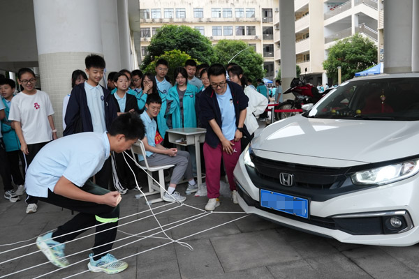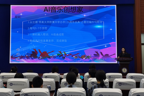 3D打印、機器人等現(xiàn)代科技發(fā)展的豐碩成果是孩子們關(guān)注的焦點,陶藝、中醫(yī)、投壺、活字印刷、艾草香囊等傳統(tǒng)技藝同樣也吸引著學(xué)生的興趣,孩子們在寓教于樂中真切地體會到了科技帶來的魅力。在現(xiàn)場,人氣最高的屬“牙齒拉車”“陶藝制作”“人工智能AI音樂制作”三個活動區(qū)域?!把例X拉車”,顧名思義即用“牙齒”去拉動一輛汽車。孩子們要“戰(zhàn)勝”的“對手”是一輛重約1.5t,即3000斤的家用小汽車,現(xiàn)場學(xué)生們的第一反應(yīng)便是“難道不會把牙崩了嗎?”原來,物理組的郭鵬老師是利用了“滑輪組可以省力”這一初中物理原理,讓拉動小汽車的所需之力變?yōu)樵瓉淼?/54,以小克大,以弱勝強,以牙拉車,看似不可能完成的挑戰(zhàn)也能輕松拿下。在“陶藝制作”區(qū),同學(xué)們圍攏在拉坯塑形工具旁,觀摩聆聽西南大學(xué)專家的示范和講解,之后,大家紛紛上手實踐,感受陶藝這一古老文化的魅力。在AI作曲區(qū),音樂組的楊雪老師帶領(lǐng)同學(xué)們?yōu)槲髂洗髮W(xué)附屬中學(xué)建校110周年校慶寫下發(fā)自肺腑的歌詞,通過AI技術(shù)創(chuàng)作各種曲風(fēng)的樂曲,為校慶獻上一首首優(yōu)美動聽的旋律。