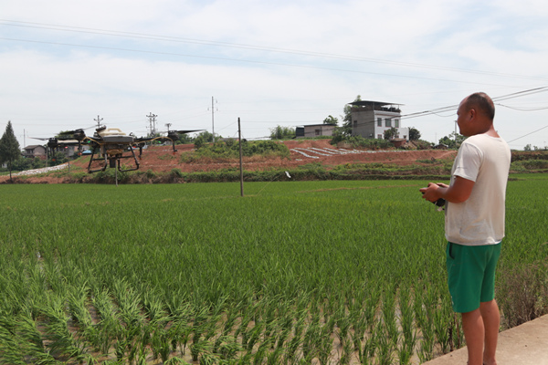 在重慶市合川區(qū)隆興鎮(zhèn)的高標準農(nóng)田里,工作人員操作無人機噴灑作業(yè)。張睿 攝