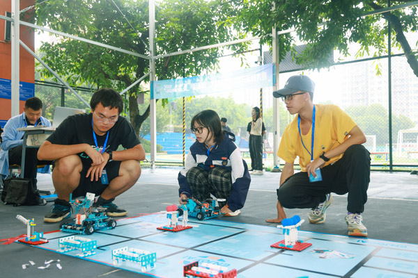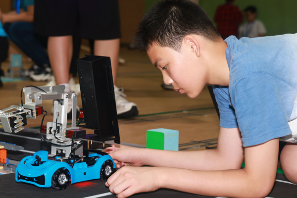 在“AI天工造物”比賽現(xiàn)場,選手們通過編輯好的程序控制機器人通過指定路徑,到不同的區(qū)域用不同的信號打卡,“收集礦石”,最終完成“火星種植”的任務(wù)。參賽選手兩人一組,一人檢查程序,一人觀察場地和機器人,配合默契,比賽在孩子們手中輕松完成。