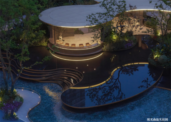 實景呈現(xiàn)的中庭園林內(nèi),迎面潺潺靈動的琉光曲池水景,香檳金色鋁板設(shè)計的湖泊會客廳,造型雅致的烏桕蜿蜒伸出,流水拂過浮嶼廊橋,營造出水光瀲滟、山色空蒙的美好意境。