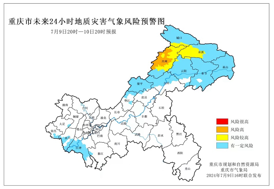 7月9日20時至7月10日20時,開州區(qū)屬于風(fēng)險高地區(qū),地質(zhì)災(zāi)害氣象風(fēng)險等級為II級(橙色預(yù)警),城口縣、巫溪縣、云陽縣屬于風(fēng)險較高地區(qū),地質(zhì)災(zāi)害氣象風(fēng)險等級為III級(黃色預(yù)警),巫山縣、奉節(jié)縣、萬州區(qū)、忠縣、墊江縣、梁平區(qū)、江津區(qū)、綦江區(qū)、大足區(qū)、榮昌區(qū)、永川區(qū)屬于有一定風(fēng)險地區(qū),地質(zhì)災(zāi)害氣象風(fēng)險等級為IV級(藍(lán)色預(yù)警)。
