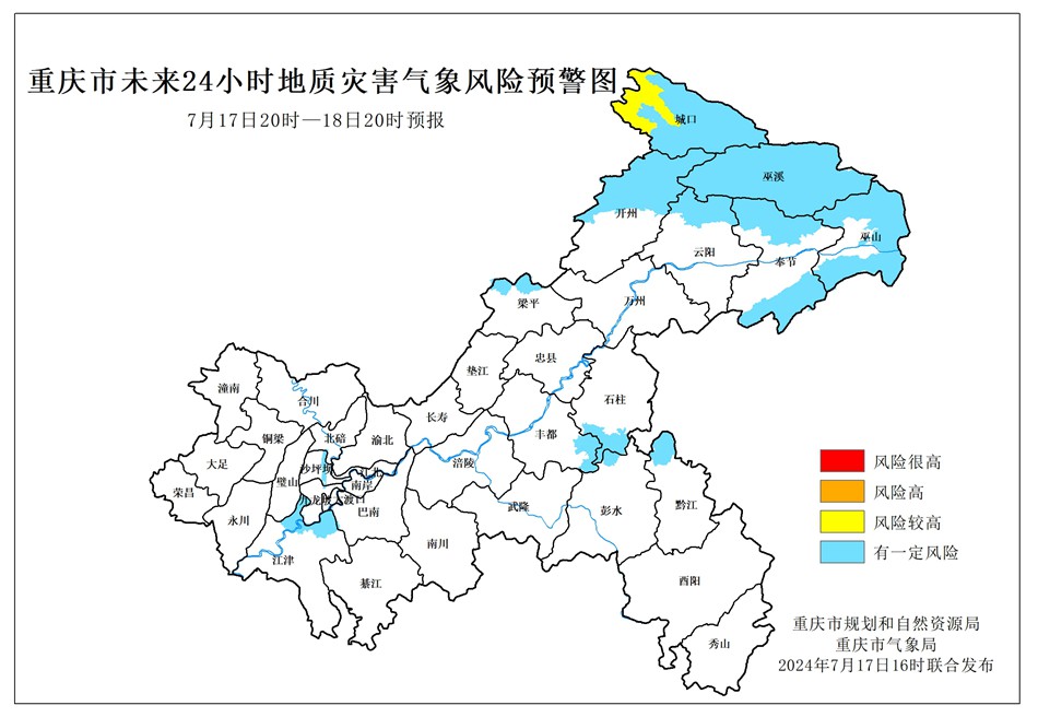 7月17日16時,重慶市規(guī)劃和自然資源局、重慶市氣象局聯(lián)合發(fā)布全市地質(zhì)災(zāi)害氣象風(fēng)險預(yù)警。