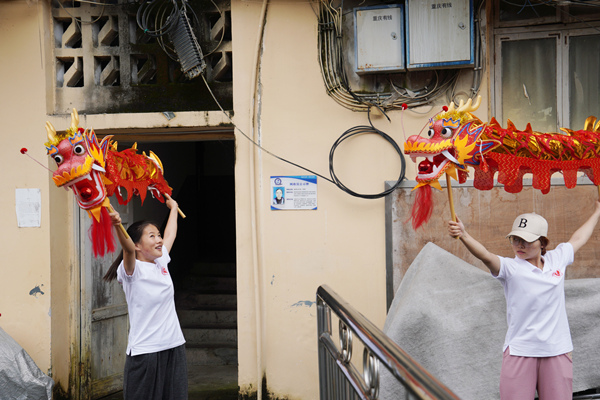 實(shí)踐團(tuán)成員學(xué)習(xí)舞龍。張笑涵攝