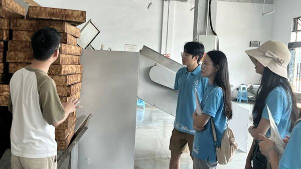 非遺傳人譚樹立帶領(lǐng)實踐團成員參觀茶廠。西南大學供圖