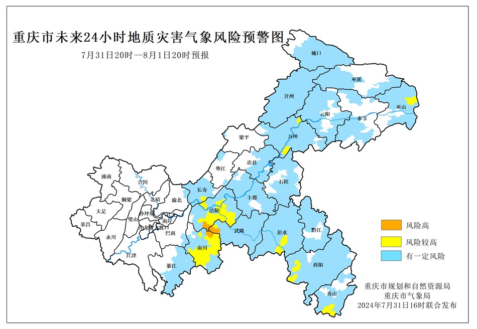 7月31日20時(shí)至8月1日20時(shí),涪陵區(qū)、南川區(qū)、武隆區(qū)屬于風(fēng)險(xiǎn)高地區(qū),地質(zhì)災(zāi)害氣象風(fēng)險(xiǎn)等級為II級(橙色預(yù)警),巫山縣、萬州區(qū)、長壽區(qū)、彭水縣、酉陽縣、秀山縣屬于風(fēng)險(xiǎn)較高地區(qū),地質(zhì)災(zāi)害氣象風(fēng)險(xiǎn)等級為III級(黃色預(yù)警),城口縣、巫溪縣、奉節(jié)縣、云陽縣、開州區(qū)、石柱縣、豐都縣、忠縣、墊江縣、梁平區(qū)、綦江區(qū)、萬盛經(jīng)開區(qū)、黔江區(qū)、巴南區(qū)、渝北區(qū)屬于有一定風(fēng)險(xiǎn)地區(qū),地質(zhì)災(zāi)害氣象風(fēng)險(xiǎn)等級為IV級(藍(lán)色預(yù)警),請相關(guān)單位注意防范。