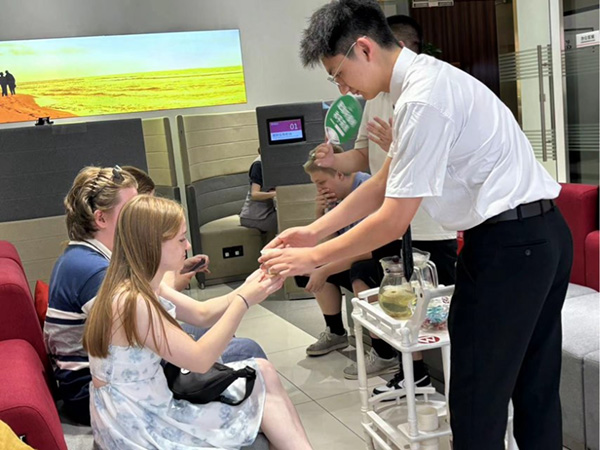 工作人員為外籍游客送上清涼飲品。招行重慶分行供圖