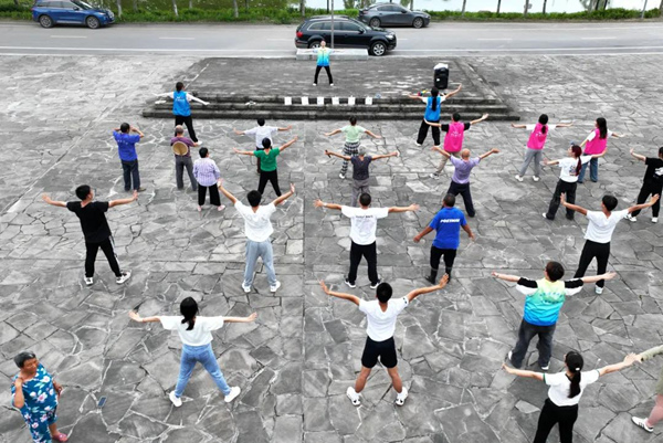 保合村活動廣場,實踐團成員教村民練習(xí)“八段錦”。陳思穎 攝