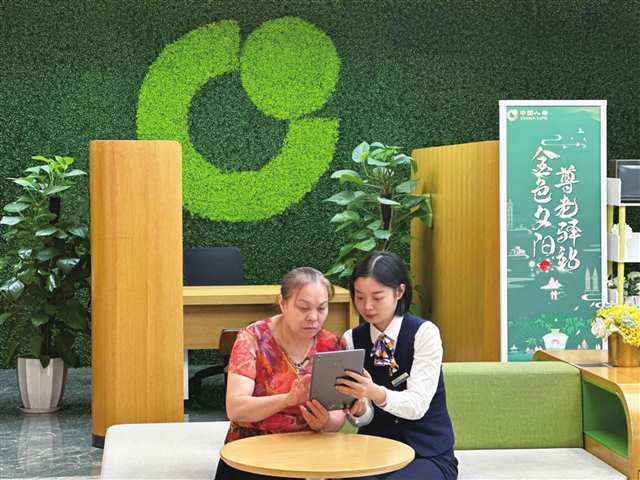 中國(guó)人壽客服人員為老年客戶講解尊老版壽險(xiǎn)App使用