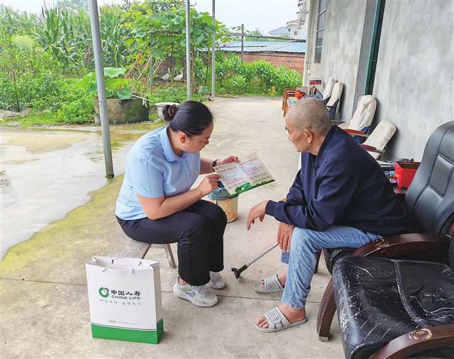 中國(guó)人壽壽險(xiǎn)重慶梁平區(qū)支公司工作人員在安寧村為村民講解孝老安康工程明白卡