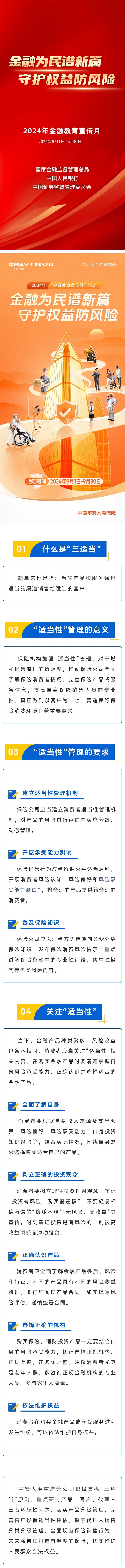 9月1日至9月30日期間,平安人壽重慶分公司積極開展2024年9月“金融教育宣傳月”活動(dòng),通過案例、漫畫、長圖等形式,幫助公眾了解金融知識(shí),認(rèn)識(shí)金融風(fēng)險(xiǎn),切實(shí)保護(hù)金融消費(fèi)者合法權(quán)益。本期主題為《一圖了解“三適當(dāng)”原則 做理性金融消費(fèi)者》,一起來看看!(平安人壽重慶分公司供圖)