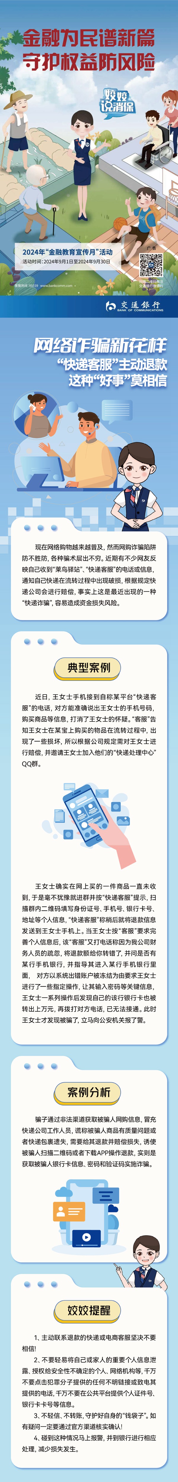 9月期間,交通銀行重慶市分行啟動(dòng)2024年“金融教育宣傳月”活動(dòng),圍繞“金融為民譜新篇,守護(hù)權(quán)益防風(fēng)險(xiǎn)”主題推出“姣姣說消?!苯鹑谥R(shí)小課堂,通過案例、長圖、短視頻等形式,幫助公眾了解金融知識(shí),認(rèn)識(shí)金融風(fēng)險(xiǎn),切實(shí)保護(hù)金融消費(fèi)者合法權(quán)益。本期分享主題為《“快遞客服”主動(dòng)退款?警惕網(wǎng)絡(luò)詐騙新花樣》。(交行重慶市分行供圖)