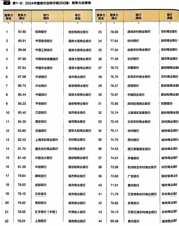 《清華金融評論》發(fā)布的“2024中國銀行業(yè)排行榜200強:競爭力總榜單”部分排名。重慶農商行供圖