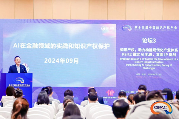 馬上消費研究院院長、科技創(chuàng)新發(fā)展部總經(jīng)理赫建營在知識產(chǎn)權(quán)年會上作主題分享。主辦方供圖