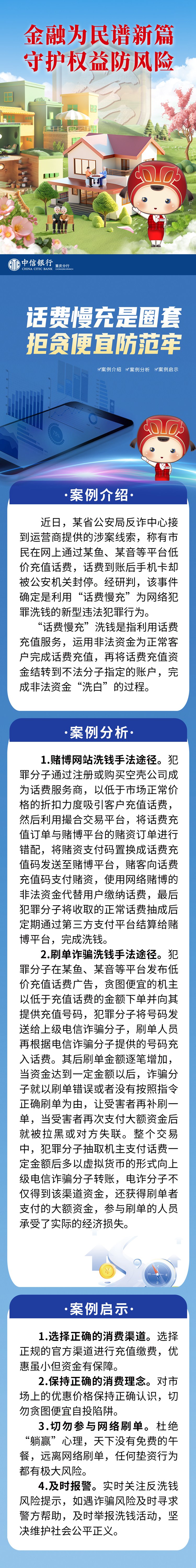 為向社會(huì)深入普及金融知識(shí),引導(dǎo)廣大人民群眾有效識(shí)別風(fēng)險(xiǎn),樹立理性的金融消費(fèi)觀、投資理財(cái)觀,切實(shí)提高防范金融風(fēng)險(xiǎn)能力。中信銀行重慶分行在2024年9月“金融教育宣傳月”活動(dòng)中,圍繞“金融為民譜新篇,守護(hù)權(quán)益防風(fēng)險(xiǎn)”主題口號(hào),特別推出“阿信金融知識(shí)小課堂”系列金融知識(shí)作品,旨在通過(guò)生動(dòng)有趣的案例解析,深入淺出地向社會(huì)公眾普及金融知識(shí),切實(shí)提升社會(huì)公眾金融素養(yǎng)及風(fēng)險(xiǎn)防范能力,積極營(yíng)造和諧健康金融環(huán)境。本期主題為:《話費(fèi)慢充是圈套,拒貪便宜防范牢》。(中信銀行重慶分行供圖)