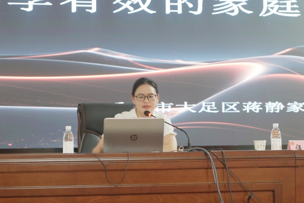 重慶市教育評估院校家社共育工作標準研制專家江均斌對校家社共育工作標準進行了深入解讀。大足區(qū)家庭教育名師工作室主持人、昌州小學校長蔣靜以《學校如何構建科學有效的家庭教育系統(tǒng)》為題,對與會人員進行專題培訓,分享了構建家庭教育體系的實踐經(jīng)驗以及相關策略。