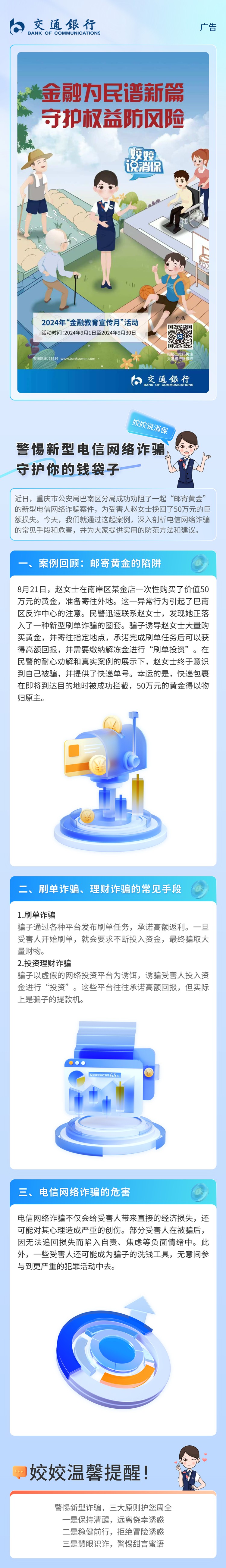 9月期間,交通銀行重慶市分行啟動(dòng)2024年“金融教育宣傳月”活動(dòng),圍繞“金融為民譜新篇,守護(hù)權(quán)益防風(fēng)險(xiǎn)”主題,推出“姣姣說(shuō)消保”金融知識(shí)小課堂,通過(guò)案例、長(zhǎng)圖、短視頻等形式,幫助公眾了解金融知識(shí),認(rèn)識(shí)金融風(fēng)險(xiǎn),切實(shí)保護(hù)金融消費(fèi)者合法權(quán)益。本期分享主題為《警惕新型電信網(wǎng)絡(luò)詐騙 守護(hù)你的“錢(qián)袋子”》。(交行重慶市分行供圖)