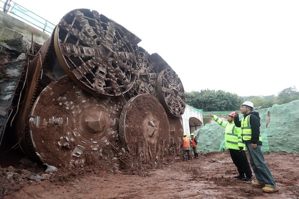 重慶花溝片區(qū)路網(wǎng)項目1號路下穿道矩形頂管貫通。中建六局供圖