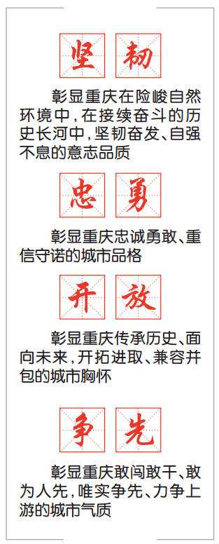 “堅(jiān)韌”彰顯重慶在險峻自然環(huán)境中,在接續(xù)奮斗的歷史長河中,堅(jiān)韌奮發(fā)、自強(qiáng)不息的意志品質(zhì);“忠勇”彰顯重慶忠誠勇敢、重信守諾的城市品格;“開放”彰顯重慶傳承歷史、面向未來,開拓進(jìn)取、兼容并包的城市胸懷;“爭先”彰顯重慶敢闖敢干、敢為人先,唯實(shí)爭先、力爭上游的城市氣質(zhì)。