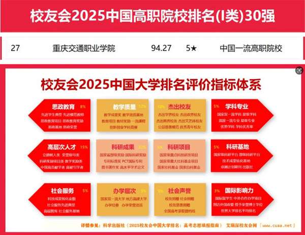 1月6日,第三方大學評價機構(gòu)艾瑞深校友會網(wǎng)(Cuaa.Net)正式發(fā)布《校友會(第23屆)2025中國大學排名》,重慶交通職業(yè)學院在2025中國高職院校排名(Ⅰ類)榜單中位列27,連續(xù)四年入圍五十強,躋身中國一流高職院校。