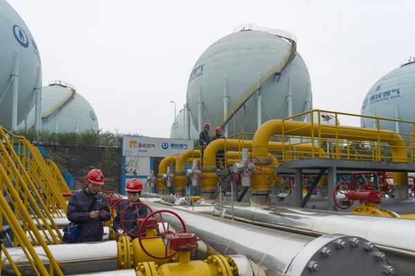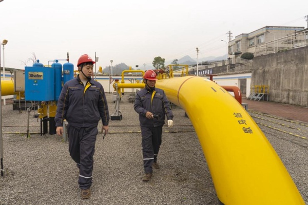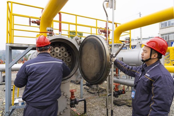 重慶燃?xì)夤ぷ魅藛T在站場(chǎng)開(kāi)展日常巡檢。重慶燃?xì)饧瘓F(tuán)供圖