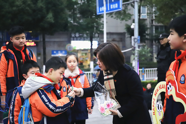 校領(lǐng)導(dǎo)們齊聚校門口,為孩子們贈上希望的種子,寓意新學(xué)期啟程和成長新篇章,愿孩子們?nèi)绶N子破土而出,茁壯成長。