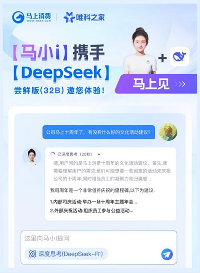 近日,馬上消費以人工智能技術為驅(qū)動,將數(shù)字人馬小i正式接入DeepSeek,打造“DeepSeek+數(shù)字化辦公”的智能平臺,構(gòu)建具備深度思考能力、“7×24小時”數(shù)字化辦公體系,在推進公司全面AI化戰(zhàn)略落地方面進入新階段。