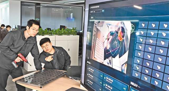 3月11日,位于兩江新區(qū)的廣域銘島數(shù)字科技有限公司,研發(fā)算法小組人員對總裝車間的工人擰緊工藝進行動作識別算法分析優(yōu)化。記者 張錦輝 攝/視覺重慶