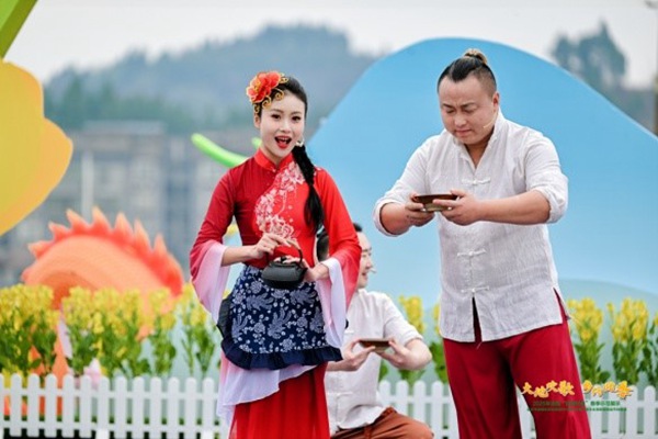 璧山區(qū)文化館帶來的傳統(tǒng)鼓舞《璧山鼓》,熱情激昂的鼓聲敲出了璧山人民的精氣神,拉開了展演序幕。南川區(qū)的山歌表演唱《妹兒端出干勁湯》、江津永興鎮(zhèn)的市級非遺“永興吆喝”《火紅的日子跳起來》、市級非遺“打蓮簫”配上潼南特有的女子獅舞,民俗舞蹈《蓮簫獅語》讓人耳目一新、諧劇《下一站》講述一段程序員的輕軌奇緣,帶給現場一片歡笑聲,還有展現榮昌美食的《榮昌好吃嘴》,體現春天踏青好時節(jié)的《百花齊放》,精彩節(jié)目一個賽一個,《幺妹一枝花》《龍騰盛世》……臺下掌聲不絕。