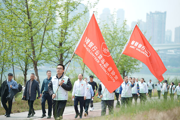 百余名員工身著印有“郵愛公益”標(biāo)識的綠色服裝,從分行大樓出發(fā),穿過江北嘴江灘公園,跨越三洞橋,在春日的暖陽下匯成一道流動的綠色風(fēng)景線。