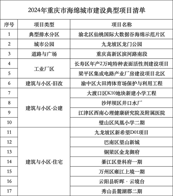 海綿城市是城市綠色發(fā)展的生態(tài)名片,海綿設施讓城市建設不僅有“面子”,更有“韌性”。近日,重慶市住房城鄉(xiāng)建委在總結各區(qū)縣海綿城市建設項目優(yōu)秀做法基礎上,選取了17個不同類型、不同做法的項目,形成2024年重慶市海綿城市建設典型項目清單。