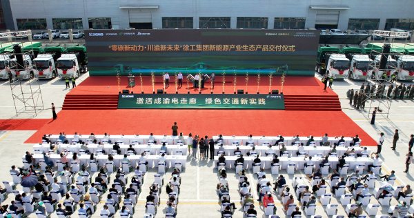 項目啟動儀式上,徐工集團交付100輛新能源重卡,現(xiàn)場還進行了重卡換電過程演示。