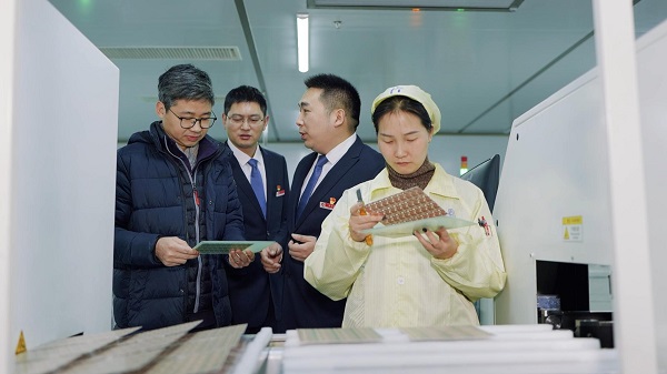 重慶農(nóng)商行開州支行客戶經(jīng)理劉中武(左二)和易秦漢(左三)到重慶忠和實(shí)業(yè)有限公司進(jìn)行貸前調(diào)查。重慶農(nóng)商行供圖