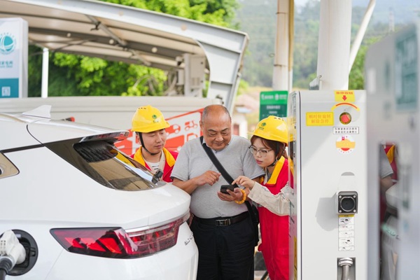 國網(wǎng)重慶永川供電公司員工在榮昌高速服務(wù)區(qū)引導(dǎo)新能源車主充電。國網(wǎng)重慶永川供電公司供圖