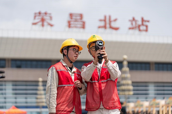 國網(wǎng)重慶永川供電公司員工在榮昌高鐵站外開展線路紅外測(cè)溫。國網(wǎng)重慶永川供電公司供圖