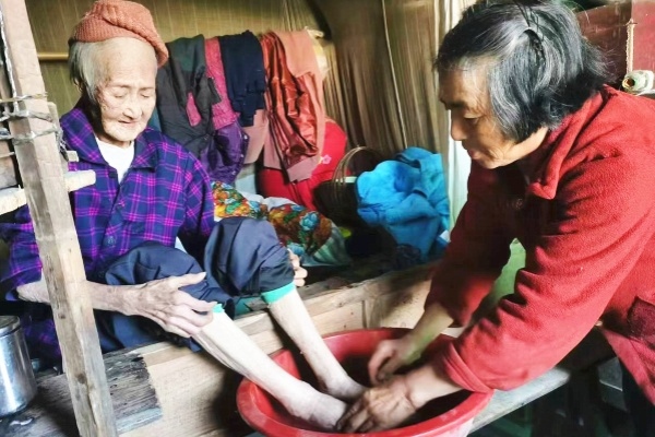 隨著譚興碧年歲漸高,身體活動能力喪失,基本臥床,曹順英和丈夫也日漸年邁??紤]到妻子照顧老人又干農活太辛苦,梁志華決定回家。曹順英感慨:“丈夫回來后,我輕松了許多,但照顧老人的責任一點沒少?!狈蚱薹止っ鞔_,丈夫主抓農活,曹順英農忙時搭把手;家務由曹順英負責,丈夫有空也幫忙。多數(shù)時候,曹順英在家專心照顧老人,端屎接尿、翻身換被褥、洗漱梳頭、擦身換衣,梁志華常給老人洗腳,老人若有個頭疼腦熱,他不管何時都背老人去村衛(wèi)生站看病。曹順英說:“‘婆婆’沒了咀嚼能力,丈夫就常把豬肉剁成肉泥熬粥,一勺勺喂給老人。天氣好時,還背老人到院壩曬太陽?!?/p>
