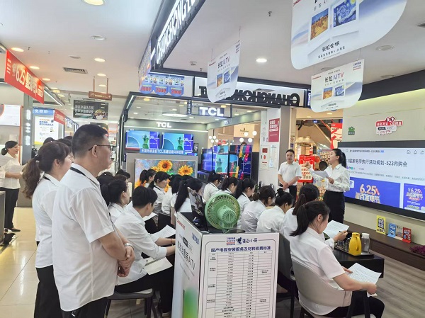重慶農(nóng)商行“金融特派員”為商戶店員講解“國補(bǔ)煥新 提振消費(fèi)”活動內(nèi)容。重慶農(nóng)商行供圖