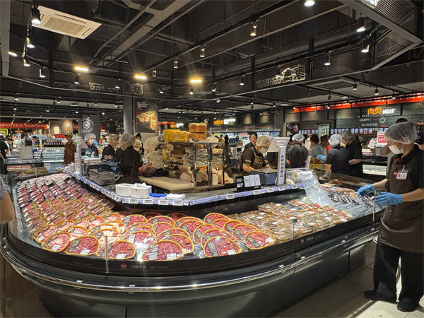 在空間設(shè)計(jì)上,門店取消傳統(tǒng)超市的強(qiáng)制動(dòng)線設(shè)計(jì),過道拓寬至3米以上,貨架統(tǒng)一降至1.6米,強(qiáng)化商品可達(dá)性與選購舒適度。服務(wù)細(xì)節(jié)方面,新增身高體重秤、直飲水、微波爐等便民設(shè)施,設(shè)有寵物安置區(qū),海鮮、肉禽柜臺(tái)提供定制加工服務(wù)。散裝食品區(qū)標(biāo)注“1斤約×個(gè)”,調(diào)味品區(qū)配設(shè)放大鏡,細(xì)節(jié)設(shè)計(jì)更具人性化。