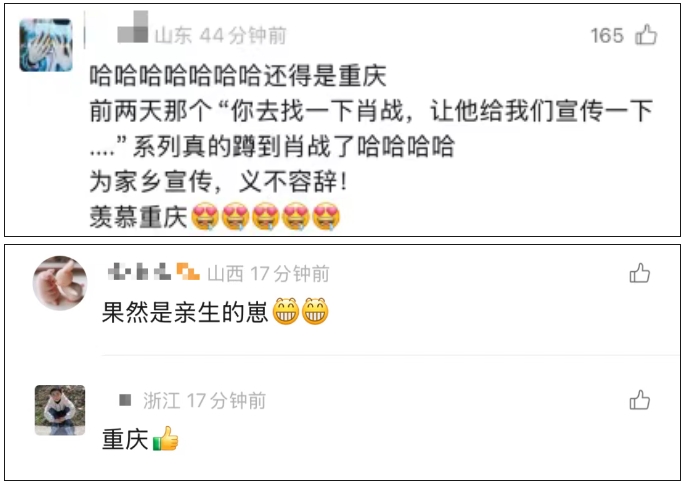 真是咱重慶“親生的”崽兒,積極響應家鄉(xiāng)的“call”,一“搖”就到,有速度。視頻一出,熱度瞬間飆升,網(wǎng)友紛紛留言:“還得是重慶,第一個把肖戰(zhàn)叫來的”!