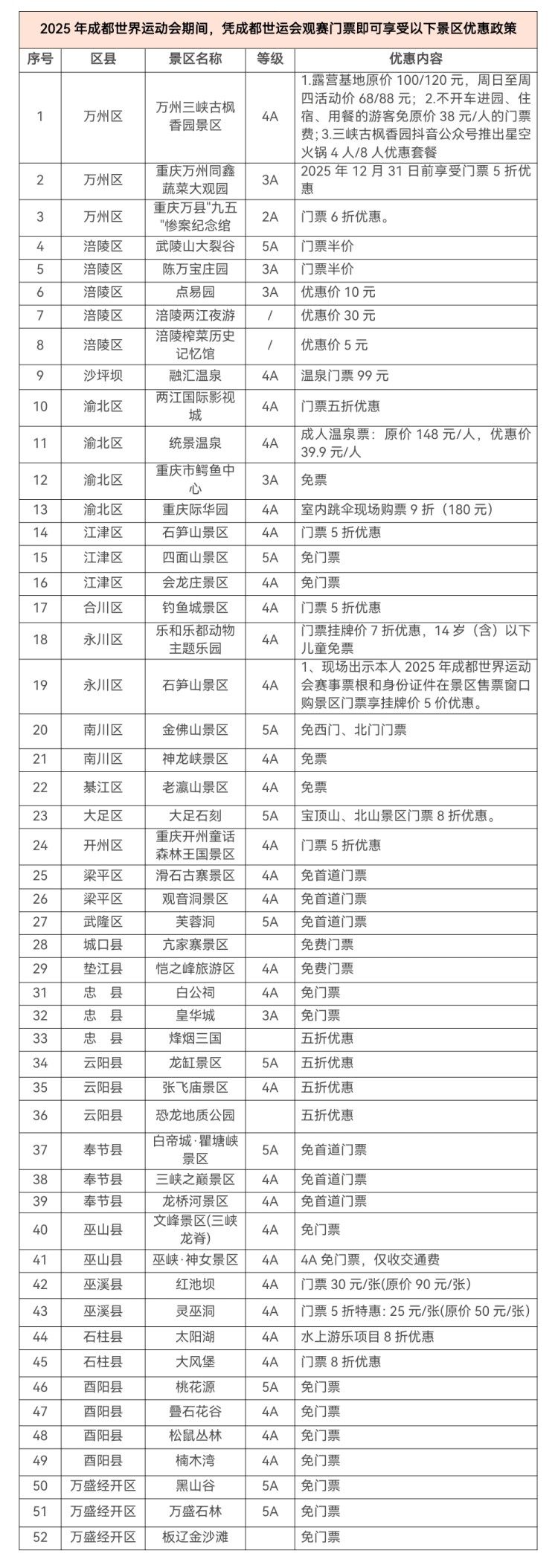 據(jù)了解,2025年成都世運會期間,重慶52家旅游景區(qū)針對世運會觀賽游客推出免門票、五折優(yōu)惠等重磅景區(qū)優(yōu)惠政策(詳見附表),包括5A級景區(qū)10家、4A級景區(qū)29家、3A級景區(qū)5家,凡持有2025年成都世運會賽事門票的觀眾,憑票根可享受景區(qū)門票特惠(每張票根限享1次優(yōu)惠)。