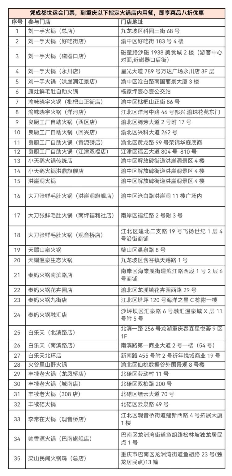 為了讓全球市民游客感受重慶麻辣與熱情,即日起至9月底,2025不夜重慶生活節(jié)期間,劉一手、渝味曉宇火鍋、小天鵝等近15家重慶知名火鍋品牌、近40家火鍋門店以8折優(yōu)惠接待觀賽游客。