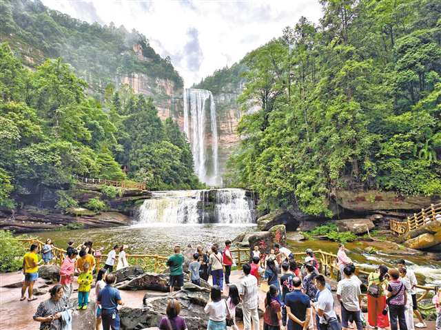 8月16日,江津區(qū)四面山景區(qū)望鄉(xiāng)臺(tái)瀑布,眾多游客在此賞景。