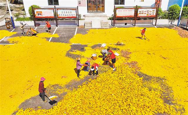 8月18日,墊江縣曹回鎮(zhèn)安山村村辦公室院壩,該村志愿者在幫助村民脫玉米粒和晾曬玉米。