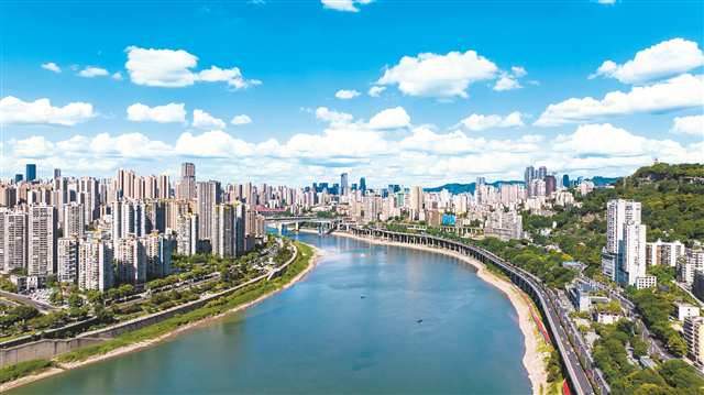 8月20日,嘉陵江渝中段,藍天白云、繁華都市和碧綠江水相映成趣,生動呈現(xiàn)重慶的自然風貌與人文氣質(zhì)。(記者 齊嵐森 攝/視覺重慶)