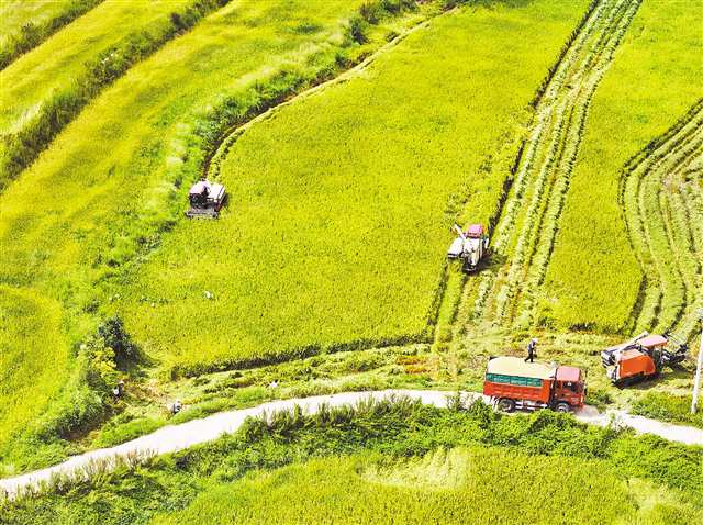 當(dāng)日是處暑節(jié)氣,我市各地積極搶抓晴好天氣開展水稻收割,田間地頭處處是繁忙景象。(特約攝影 劉輝/視覺重慶)
