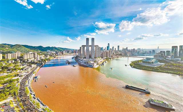 據(jù)了解,這一奇景一般出現(xiàn)在每年夏季汛期,因兩江上游泥沙含量差異所致。(記者 齊嵐森 攝/視覺重慶)