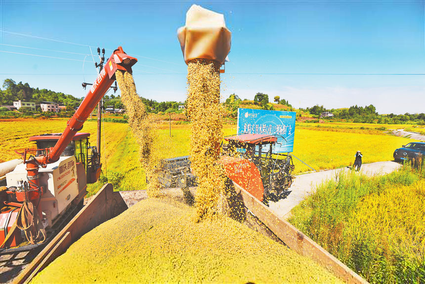 8月26日,合川區(qū)隆興鎮(zhèn)玉河村,收割機(jī)正將“米粉稻”裝車(chē)。